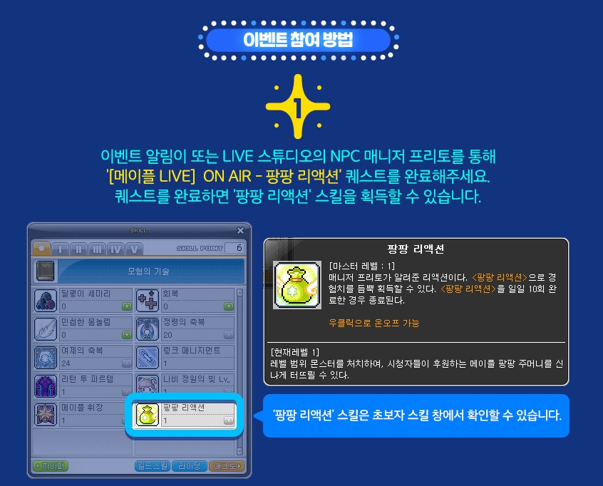이벤트 알림이 에서 팡팡리액션 퀘스트를 완료해주시면 팡팡 리액션 스킬을 얻으실 수 있습니다.