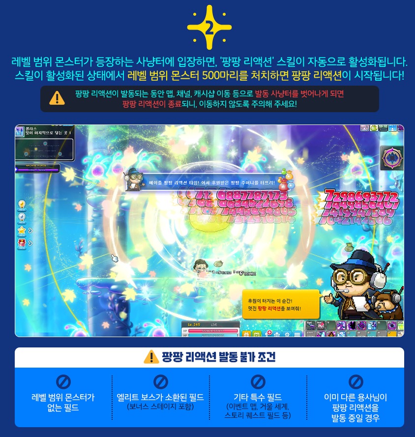 팡팡 리액션 발동불가 조건은 레벨범위 몬스터가 없는 사냥터 , 엘리트 보스가 소환된 필드 , 기타 특수 필드 입니다.