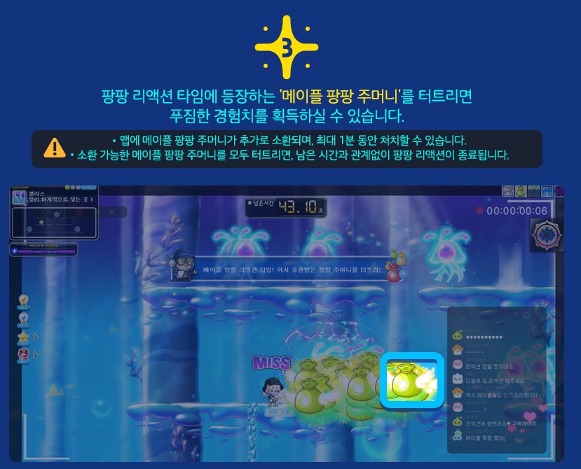 팡팡 리액션 타임에 등장하는 메이플 팡팡 주머니를 터트리면 푸짐한 경험치를 획득하실 수 있습니다.