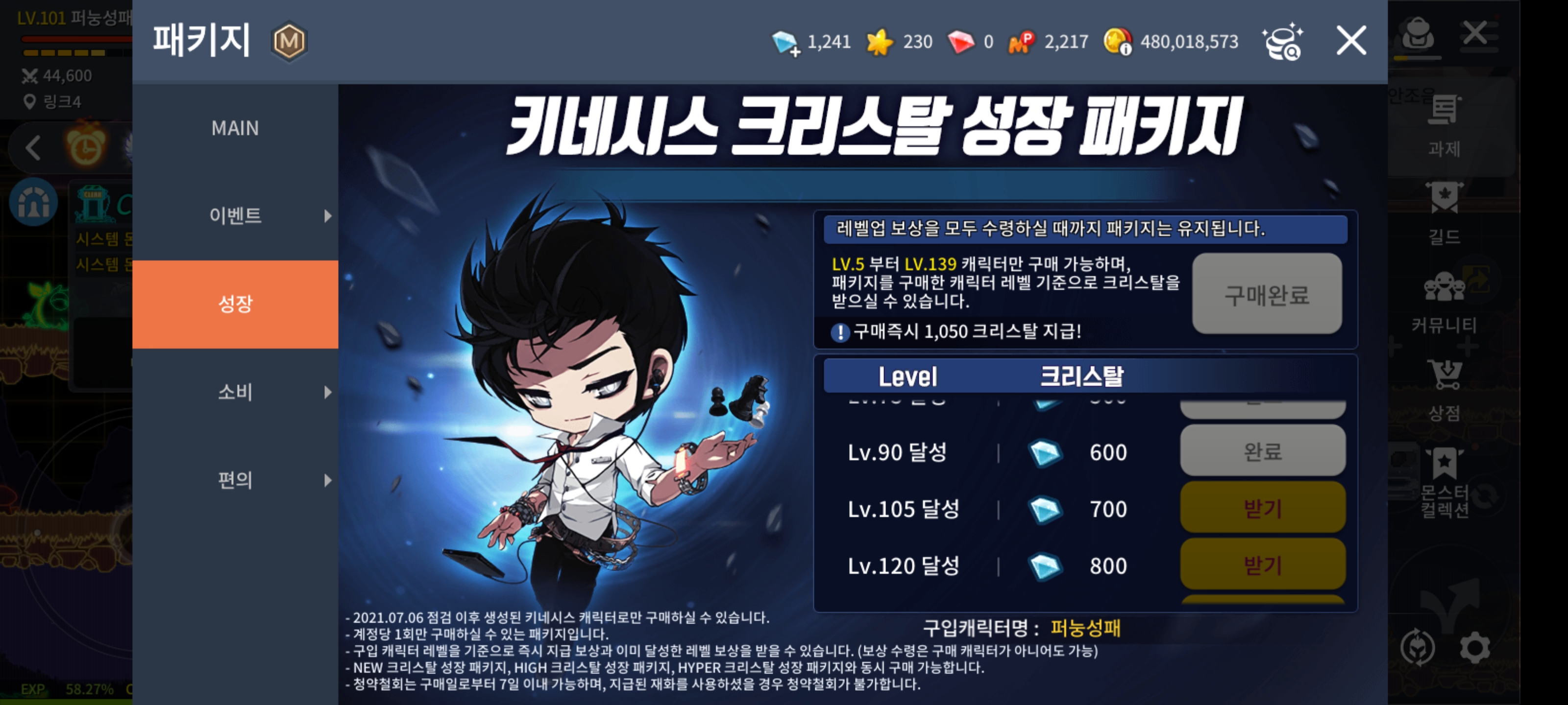 키네시스 크리스탈 성장 패키지입니다. 이건 140까지 구입이 가능한 첫번째 성장패키지입니다.