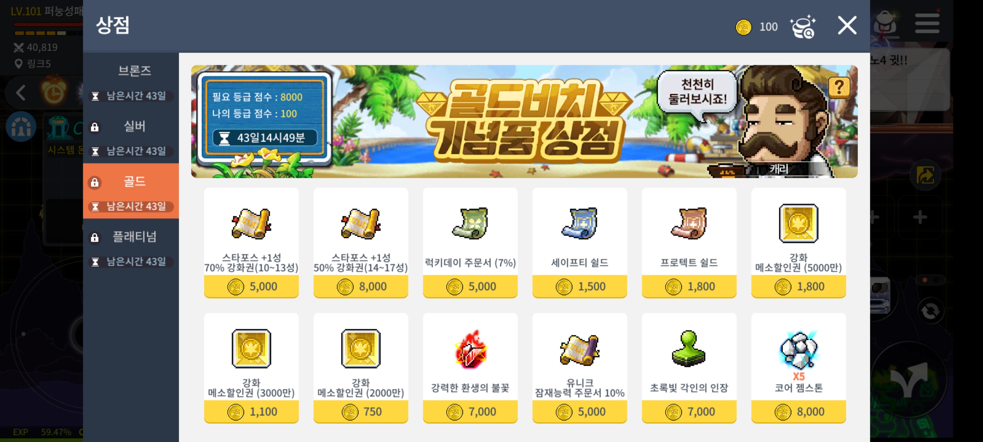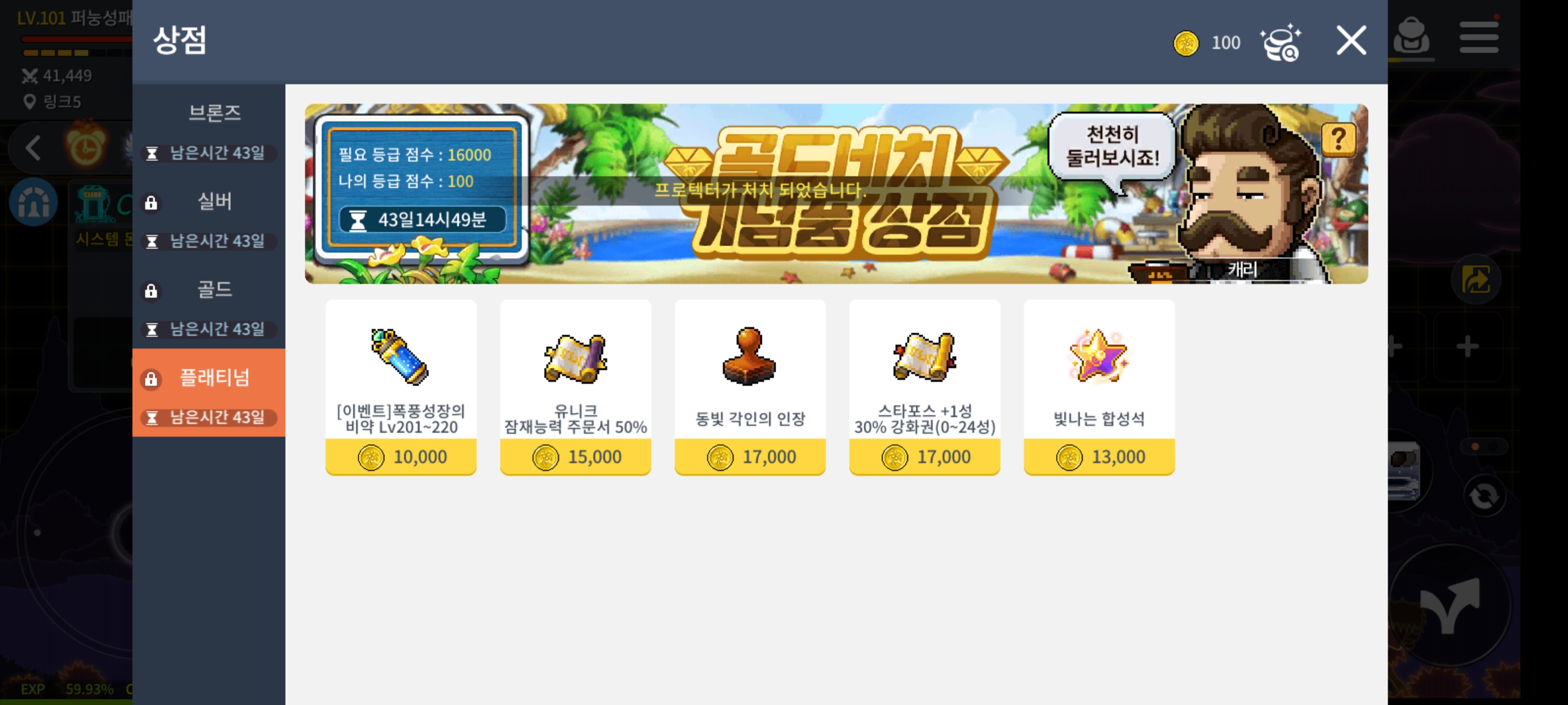 플레티넘 등급입니다 .폭풍성장의 비약을 판매하고 있고 , 유니크 잠재와 스타포스 강화권이 판매되고 있습니다.