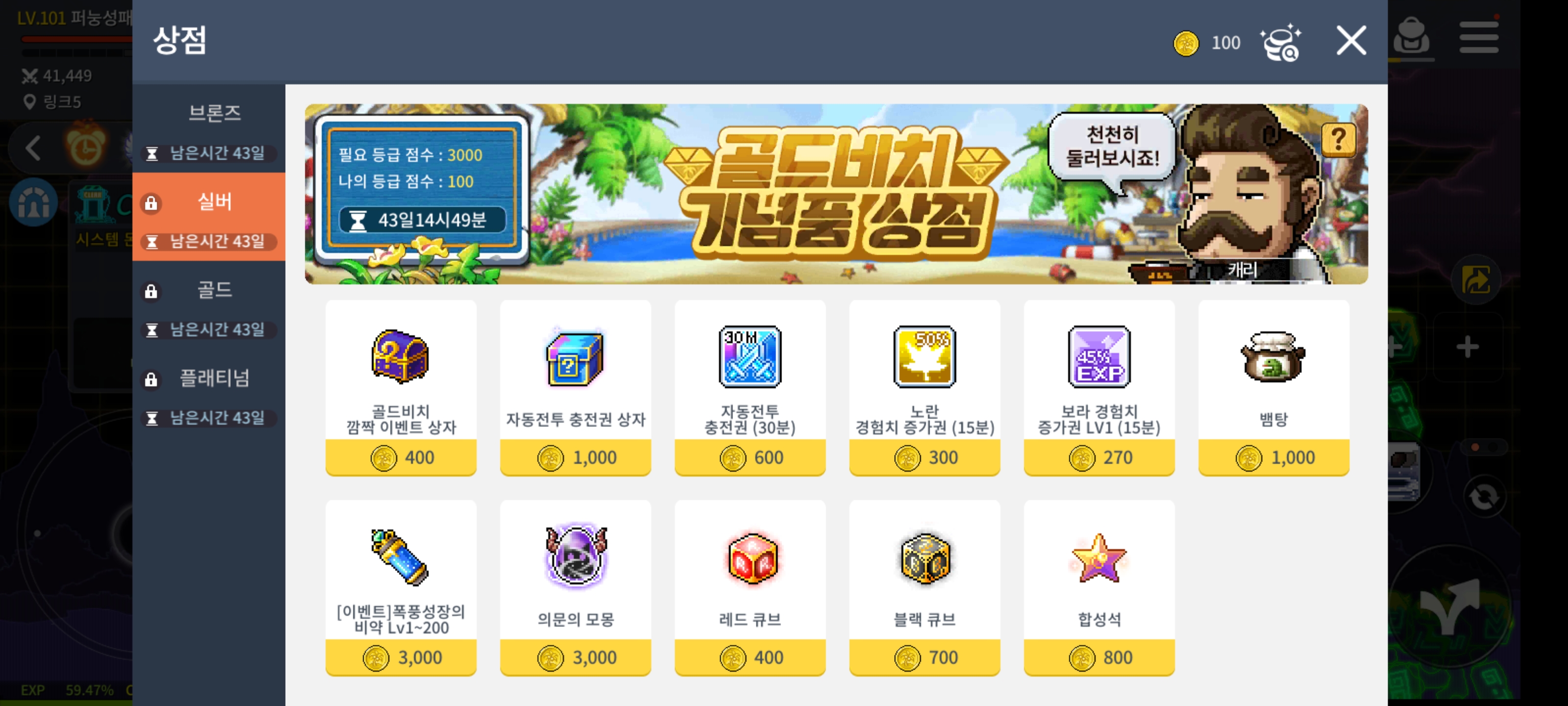 실버등급은 골드비치 깜짝 이벤트 상자와 , 자동전투 충전권 , 그리고 폭풍성장의 비약이 판매되고 있습니다.