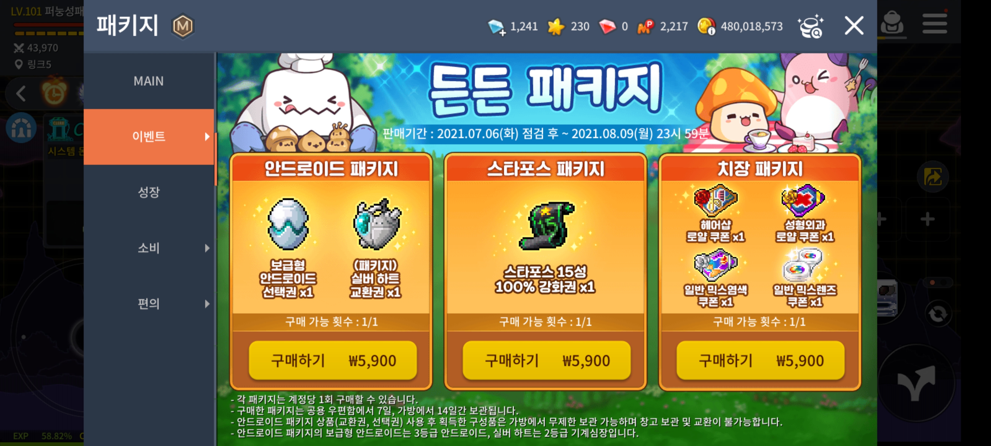 제가 확인했을때는 스타포스 패키지 15성 스타포스 강화권이 제일 괜찮은 패키지인것 같습니다. 가격은 5900원입니다