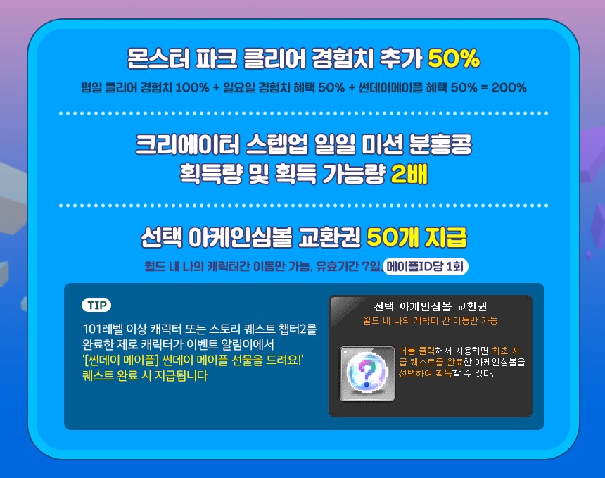 썬데이 메이플를 합하면 100% 가 되는데요.. 일요일에는 몬파 경치가 두배가 됩니다.