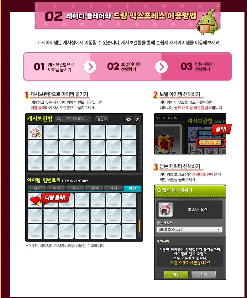 캐시 보관함으로 아이템을 옮긴 후 보낼 아이템을 선택하고 받는 캐릭터를 선택해주면 됩니다.