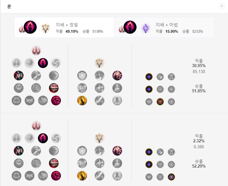 핵심 룬은 주로 수확을 들며, 하위 룬으로는 비열한 한방/궁극의 사냥꾼/침착/최후의 일격을 드는 것이 좋다. 특히 침착 풀스택이 쌓이면 웬만하면 마나가 동날 일은 없다. 굶주린 사냥꾼의 경우 모든 스킬이 광역기인 럭스에게 회복 효율이 좋지 않다.