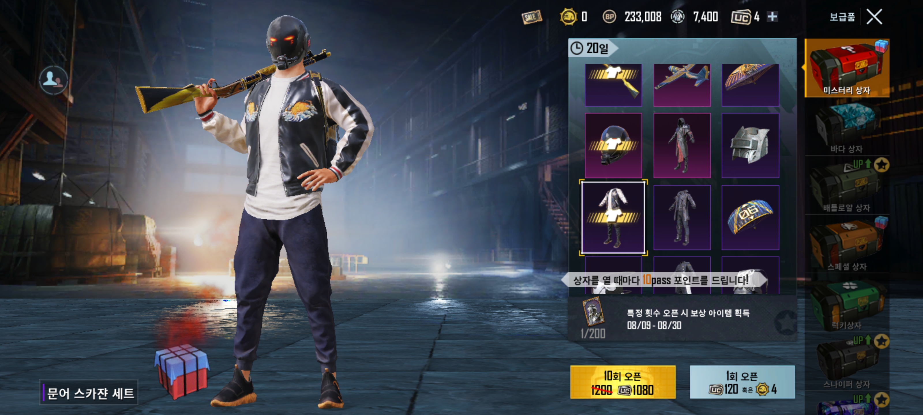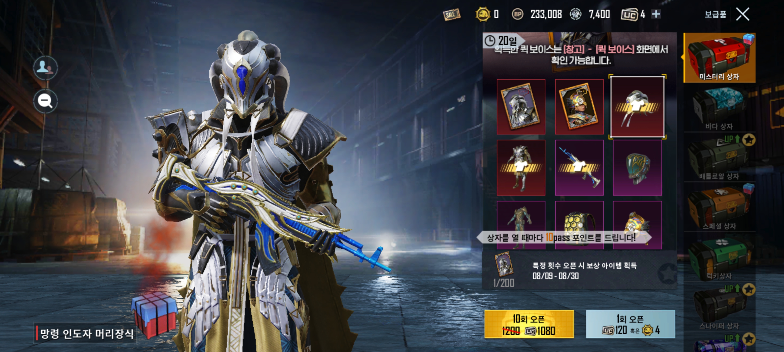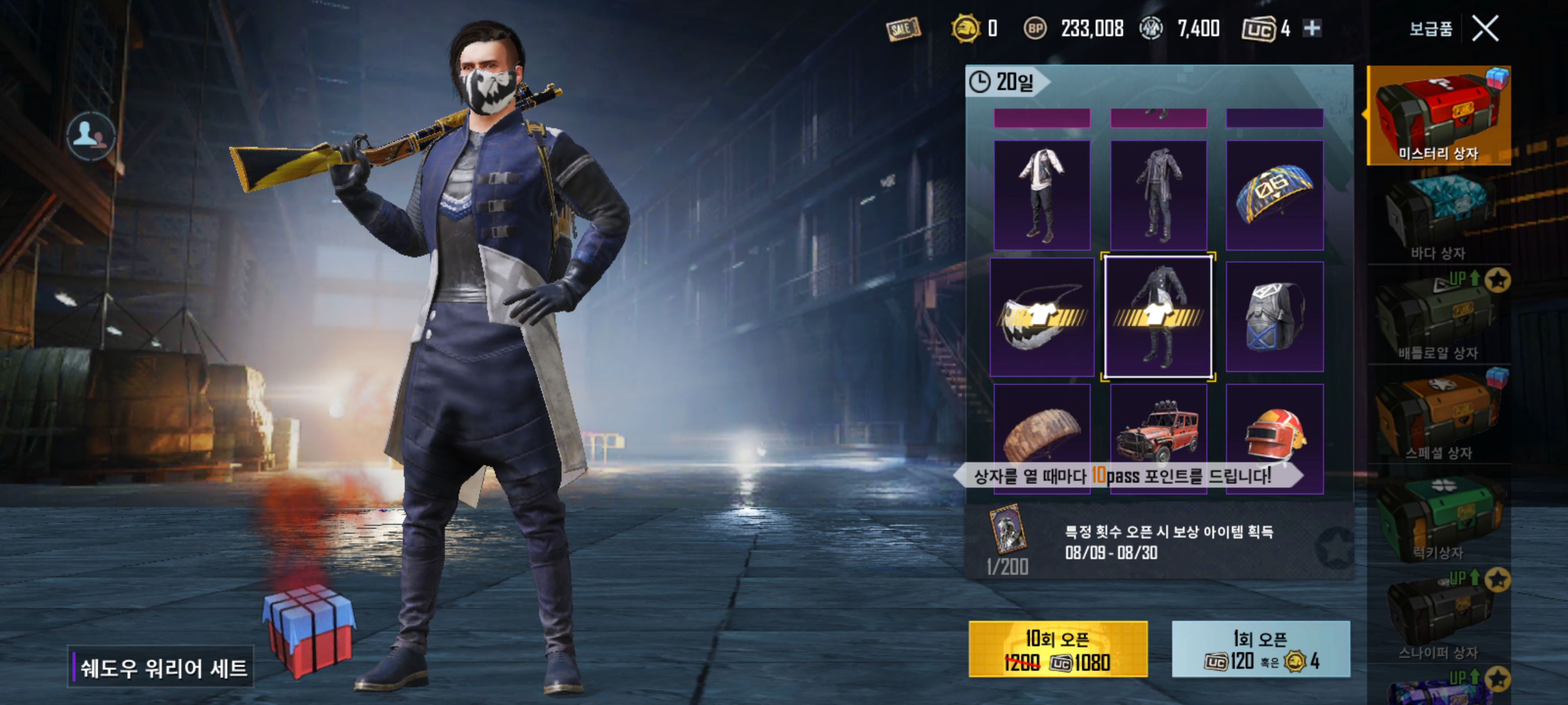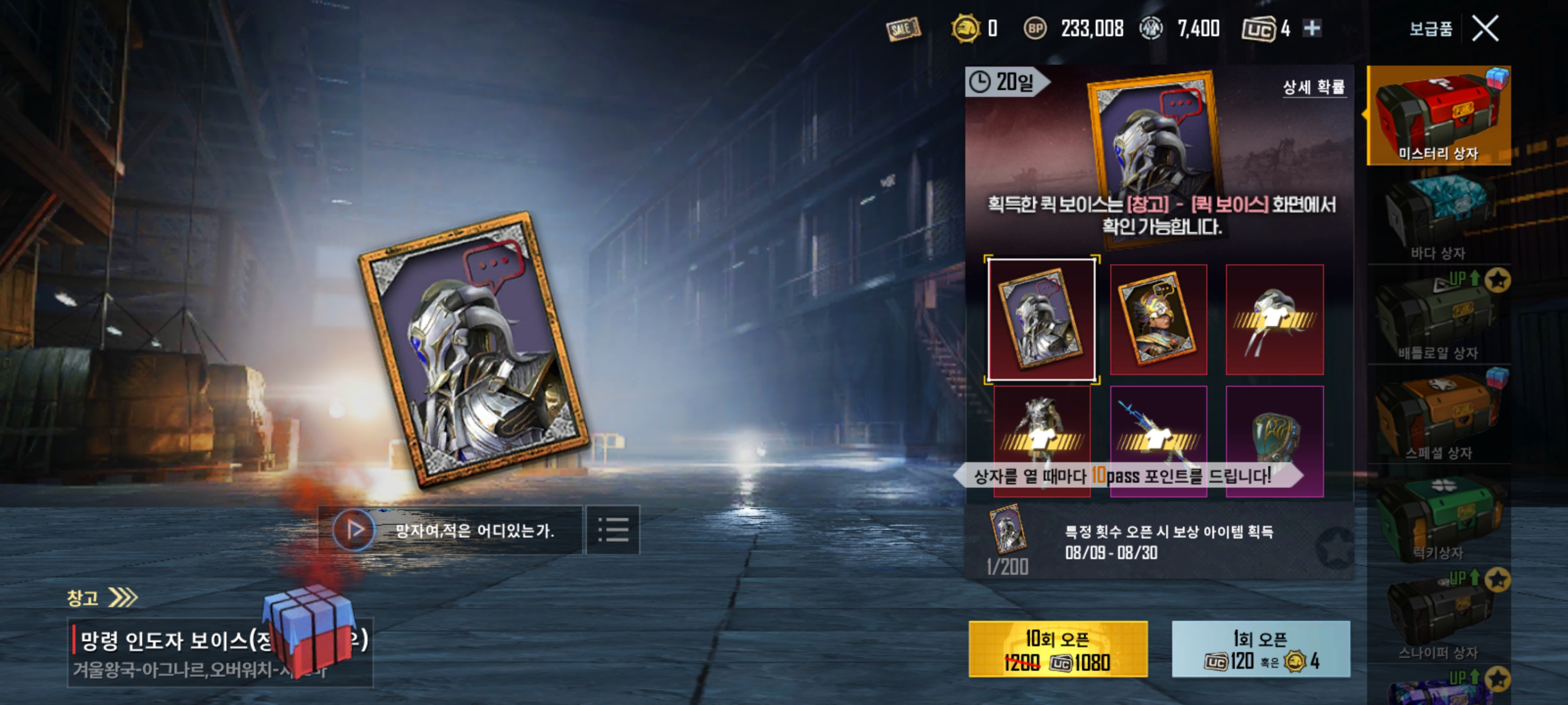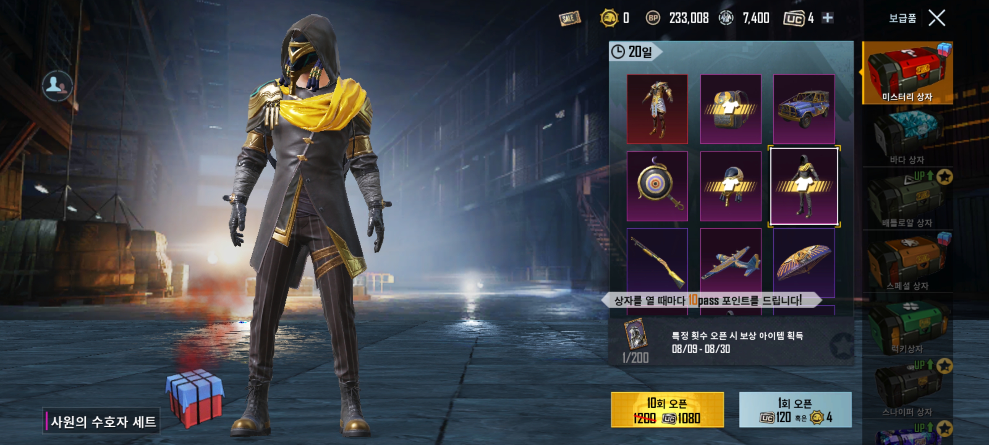 망령인도자 세트에 대해 알아보겠습니다. 1회 오픈시 120 uc 가 들어가고 10회 오픈시에는 할인된 가격은 1080uc 가 소비됩니다.