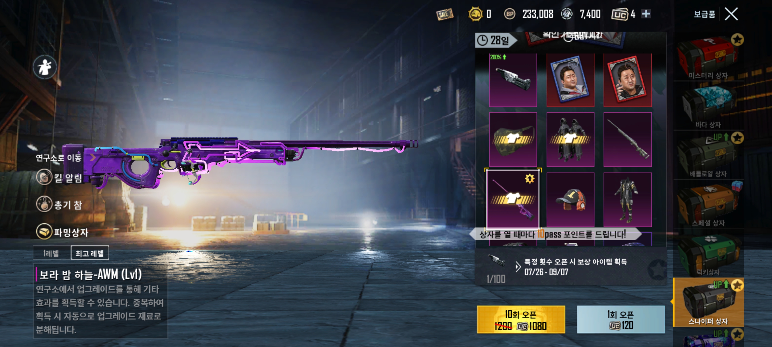 AWM 보라 밤 하늘 총기 스킨입니다 레벨업 업그레이드를 할 수 있는 총기 스킨입니다.