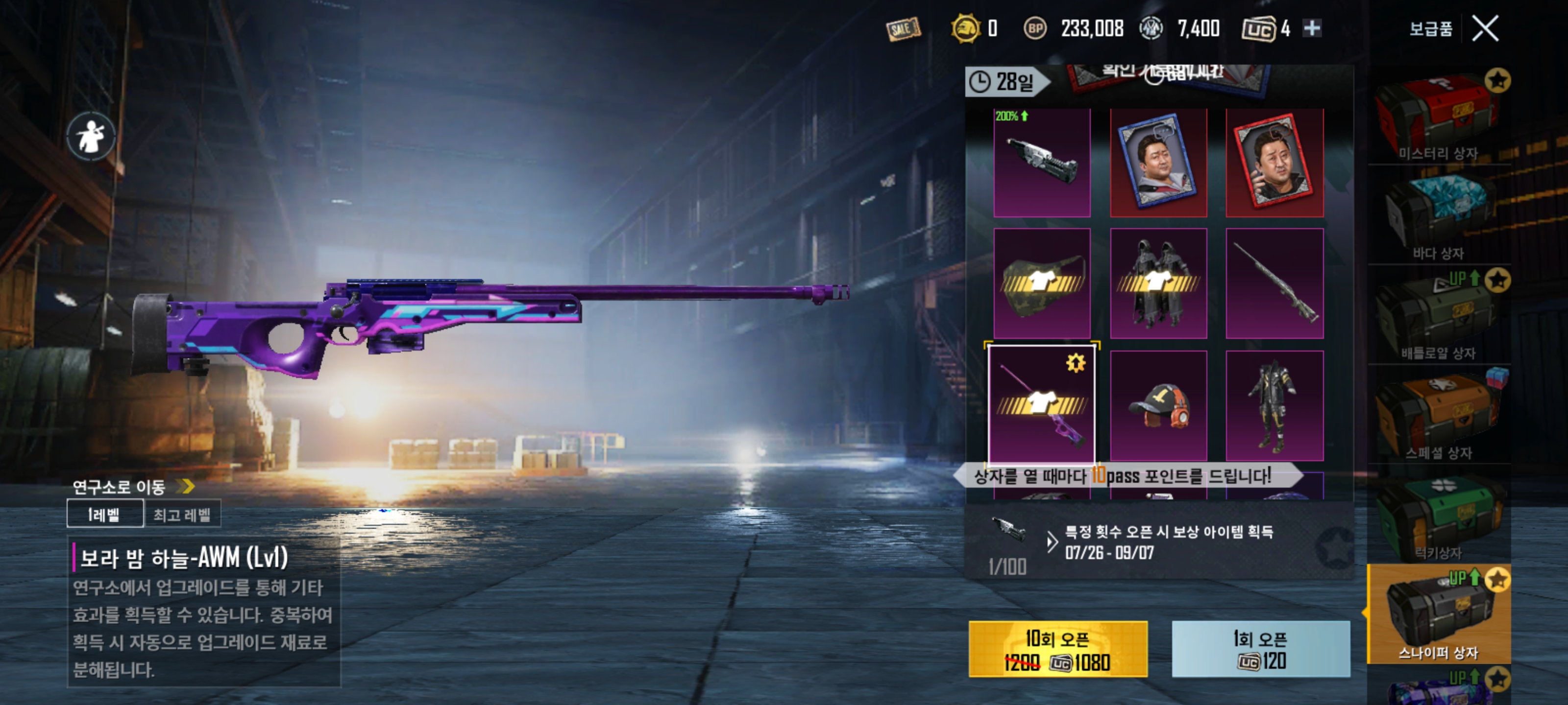 AWM 보라 밤 하늘 총기 스킨입니다 레벨업 업그레이드를 할 수 있는 총기 스킨입니다.