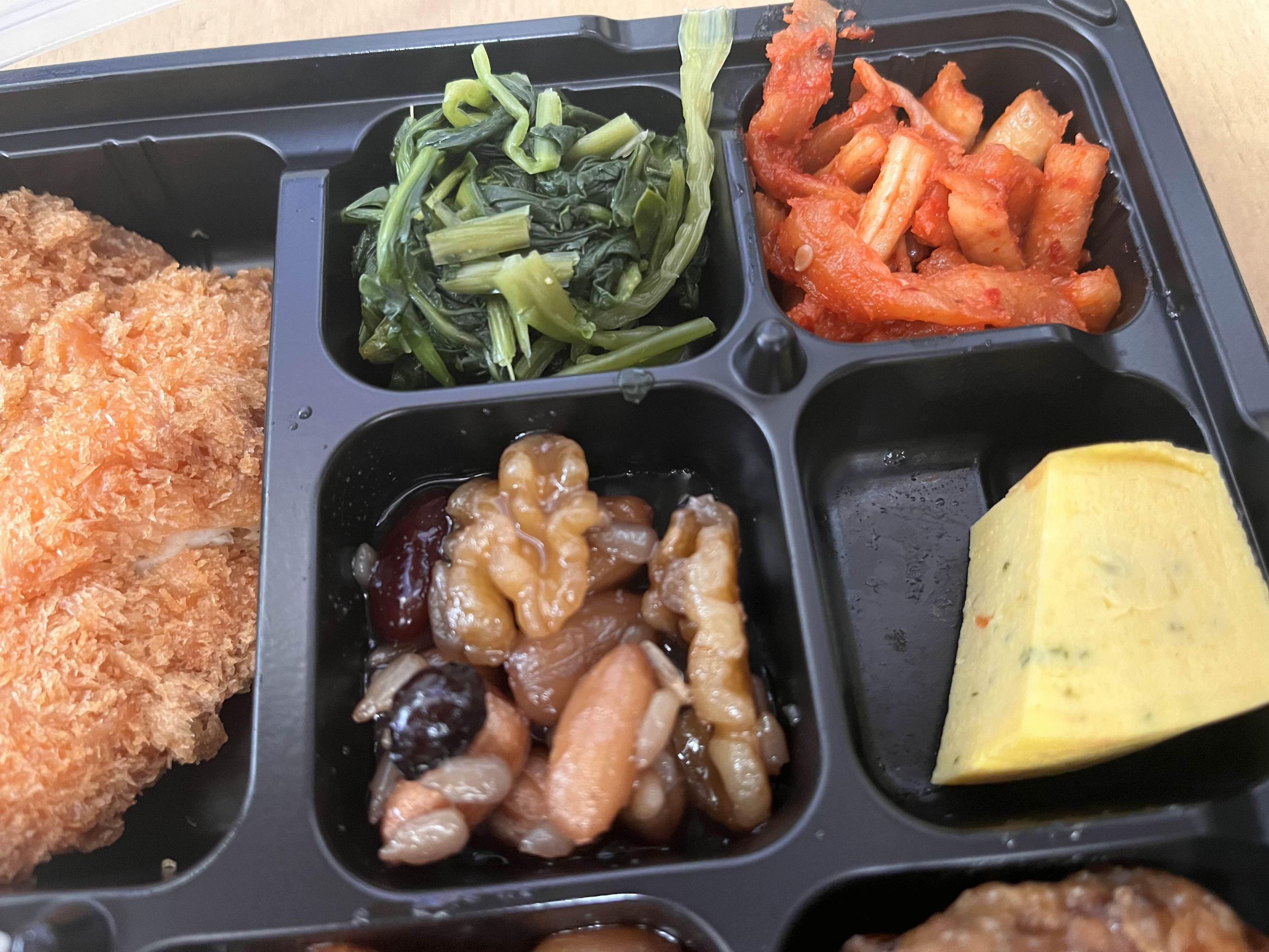 부반찬으로 나물 , 무장아찌 , 견과루무침이랑 계란말이 반토막이 있습니다.