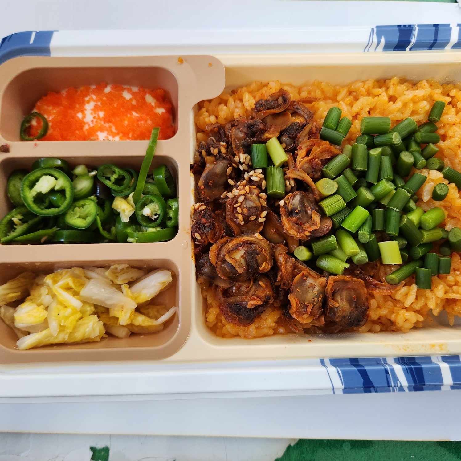 밥위에 쪽파와 꼬막이 올라가 있구 , 사이드로 흰김치와 , 고추 슬라이스와 날치알에 마요네즈 소스가 있습니다.