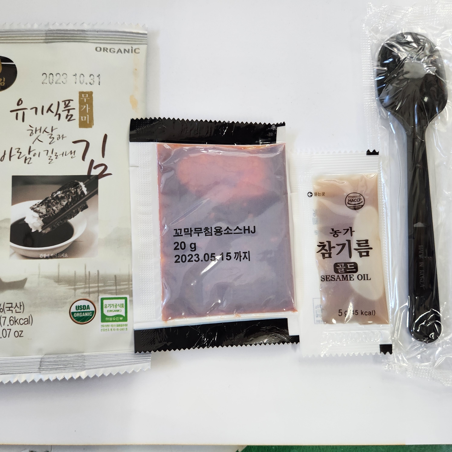 김이 하나 들어가 있구 , 꼬막 무침용소스와 농가 참기름과 숫가락 하나가 들어가 있습니다.