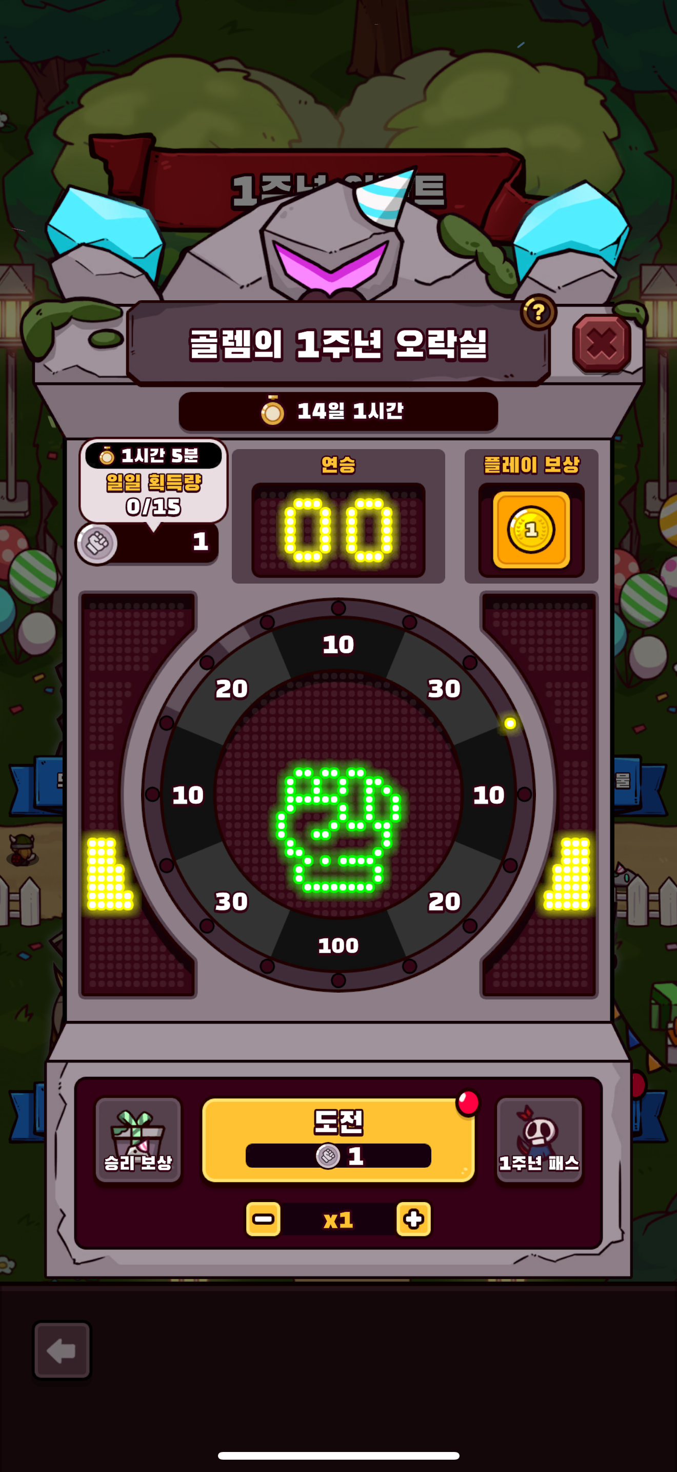 골렘의 1주년 오락실 입니다. 출석으로 하루 3개 , 게임플레이로 하루 15개를 얻을 수 있습니다. 코인을 이용해 가위바위보를 하는 이벤트로 , 승리 30번시 골렘 스킨을 얻을 수 있고요 , 도전이 끝난 후 랜덤으로 포인트를 얻어서 , 패스 보상도 받으실 수 있습니다.